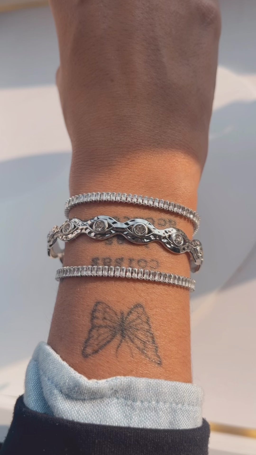 A pulseira bracelete olho strass é uma peça única que une estilo e simbolismo. Feita em metal dourado, ela traz detalhes de olho adornados com strass, adicionando brilho e significado ao seu look.