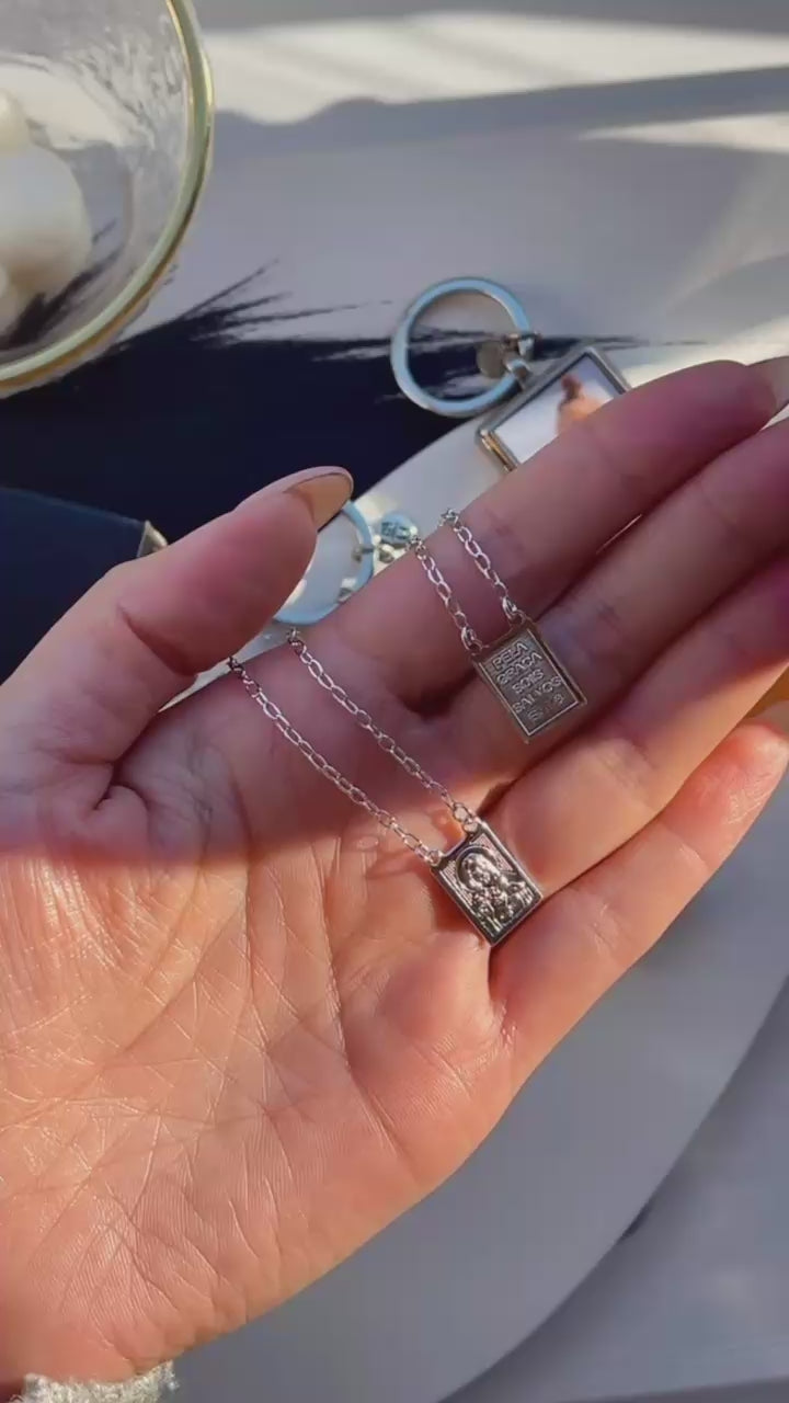 Esse escapulário masculino traz duas pequenas medalhas retangulares com acabamento fosco e imagens em alto-relevo — Nossa Senhora de um lado e Jesus do outro.