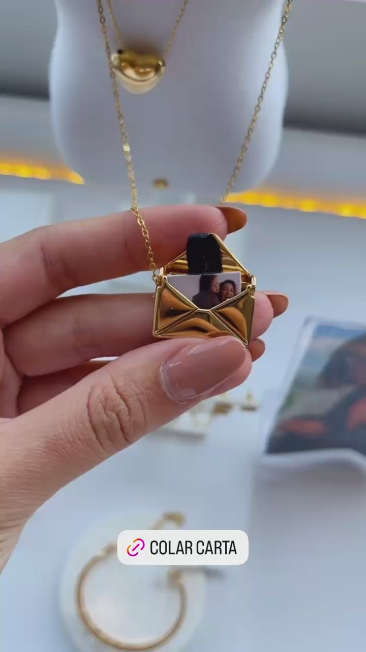 Guarde uma lembrança especial sempre perto de você! Esse relicário em formato de carta permite carregar uma foto significativa, unindo elegância e afeto em uma única peça. Um detalhe delicado para eternizar momentos inesquecíveis.