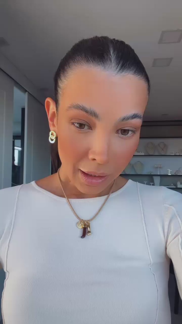 O colar tríade traz corda em tons terrosos — marrom e bege — e três pingentes cheios de simbolismo: figa, dente e medalha. Com uma pegada boho marcante, é o acessório perfeito para quem gosta de compor looks autênticos, cheios de personalidade e conexão com o que carrega.