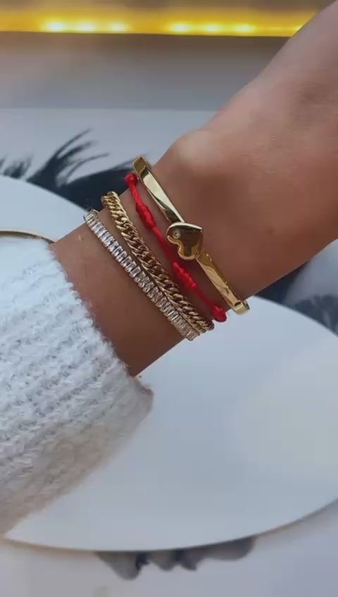 A pulseira 7 nós traz proteção contra inveja e más vibrações, enquanto o bracelete com coração e a pulseira de zircônias adicionam romantismo e sofisticação ao look. A finalização com a corrente entrelaçada traz peso e equilíbrio ao pulso.