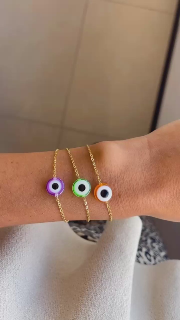 Com uma corrente delicada e pingente de olho grego, ela está disponível em três cores vibrantes: verde, laranja e roxa. Perfeita para dar um toque de cor ao look do dia a dia ou compor um mix de pulseiras com muita personalidade.