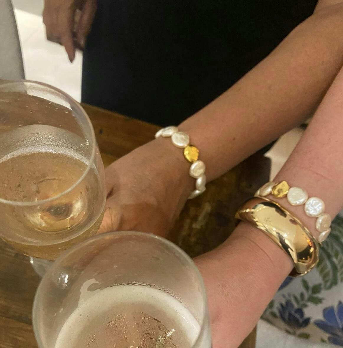 Com um design refinado, a pulseira pastilha pérola new é feita toda em pérolas artificiais no formato pastilha, intercaladas com entremeios em metal dourado e uma charmosa pastilha dourada que dá um toque de brilho e sofisticação.